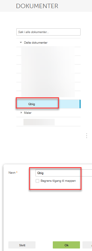- Sjekk at mappen som er opprettet i PowerOffice IKKE har begrensing. Dette gjør du ved å stå på Qbig mappen, trykk rediger og sjekk at det ikke er lagt inn noen begrensinger. Dersom det er hake på begrensinger, ta den bort